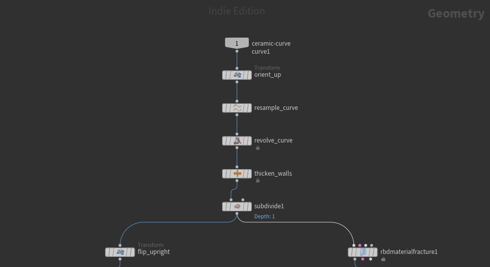 I built an HDA (Houdini Digital Asset) to generate the mesh of the ceramic piece, which includes a switch for a fractured version and an intact one. The workflow is quite simple: