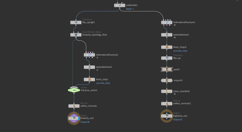 The HDA has two outputs: a low-poly version, with a switch for chipped/intact and a higher poly version, which could be useful for baking maps from high-poly to low-poly in the future (with software like xNormal, or even inside Houdini1).