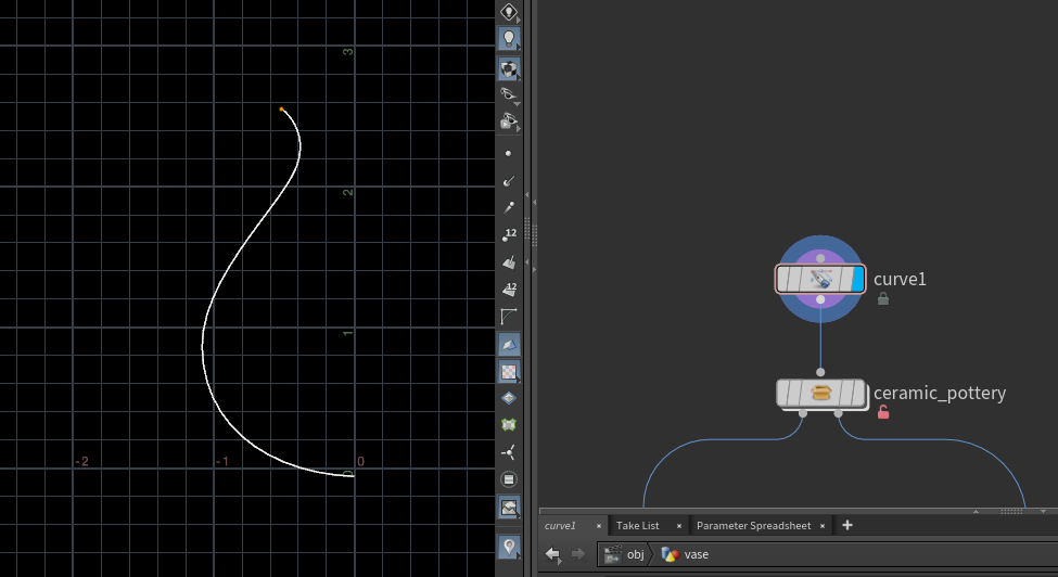 - The HDA takes one input (a curve), which defines the outer shape of the vase
